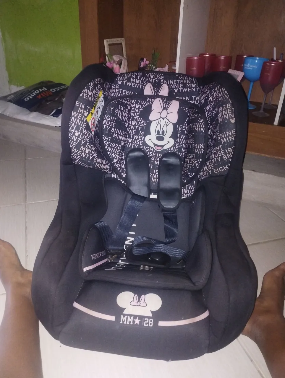 Cadeira para auto da Minnie Mouse, perfeita para transportar seu bebê com segurança e conforto. Design encantador e acolchoado para o máximo de conforto durante os passeios.