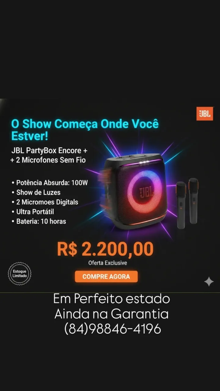 Leve a festa para qualquer lugar com a Caixa de Som JBL PartyBox Encore! Com 100W de potência, show de luzes e 2 microfones digitais, o som é incrível e a diversão garantida. Ultra portátil e com bateria de 10 horas, a festa não tem hora para acabar!