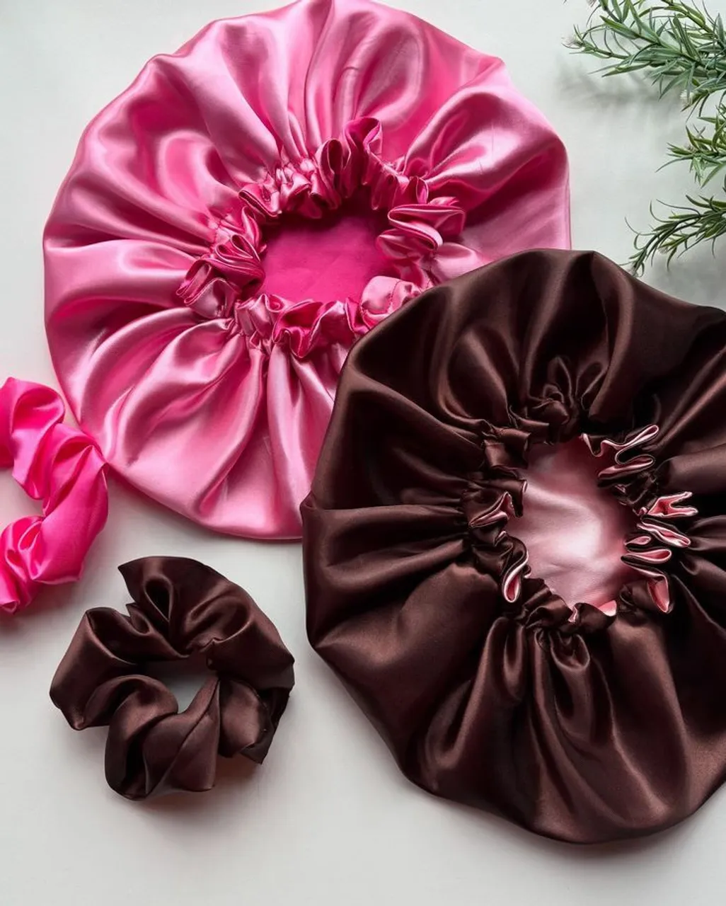 Acessórios de cabelo em cetim: toucas, scrunchies, máscara de olhos, fronha de travesseiro, modelador de cachos. Para todos os tipos e tamanhos de cabelos, proteja seus fios de agentes externos, e frizz.