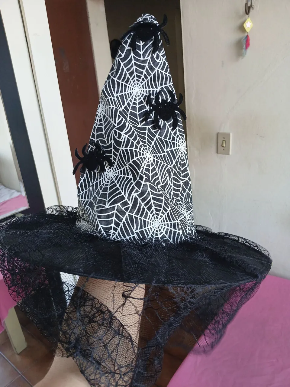 Chapéu de bruxa temático de Halloween com estampa de teia de aranha e detalhes de aranhas. Perfeito para completar sua fantasia!usado so uma vez , mas informações entrar em contato no adm.