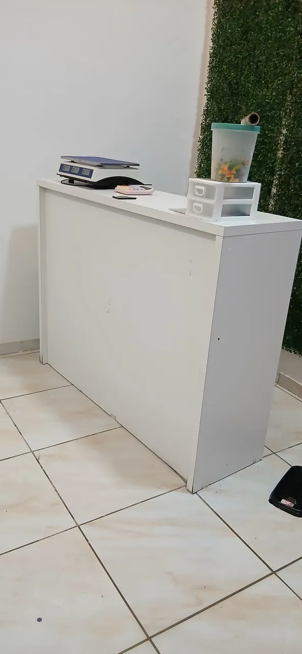 Balcão de caixa branco, ideal para otimizar o espaço e organizar seu comércio. Design moderno e funcional, perfeito para diversos tipos de estabelecimentos.