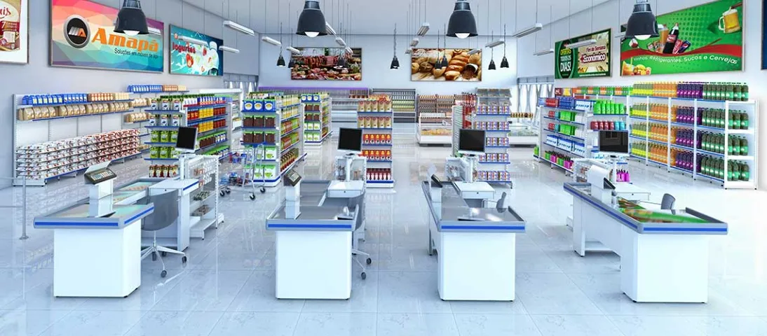 Mobiliário completo para supermercado, incluindo gôndolas, prateleiras, caixas de supermercado e balcões. Ideal para otimizar o espaço e organizar seus produtos.
