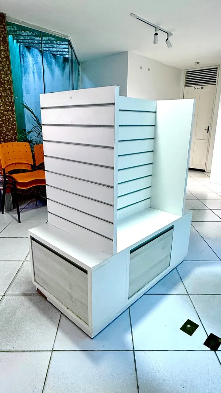 Expositor com rodas, gavetas e trilhos de encaixe adaptável perfeito para destacar seus produtos com elegância e organização. Design moderno e funcional para otimizar o espaço e atrair a atenção dos seus clientes. Ideal para diversos tipos de comércio!