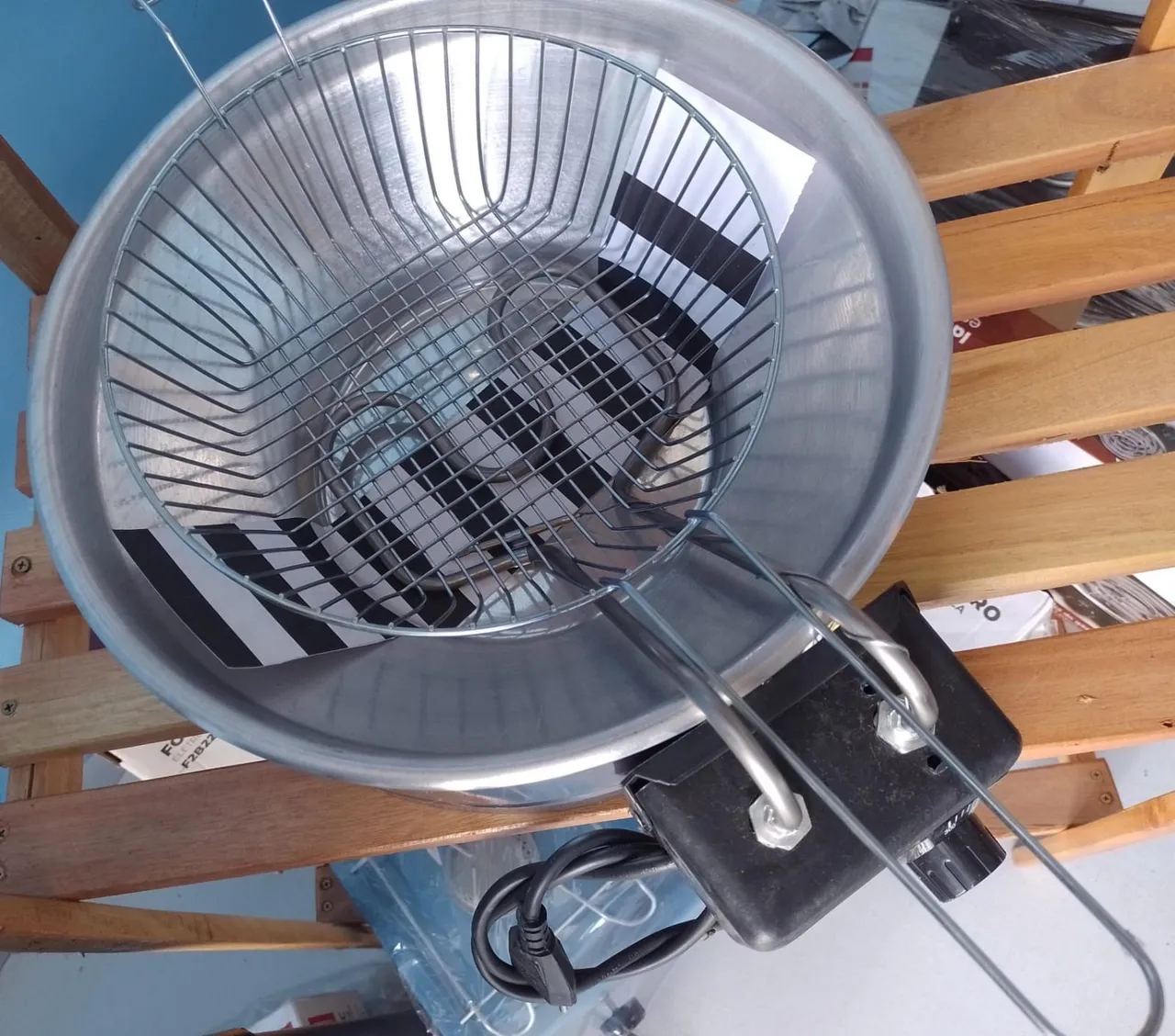 Fritadeira elétrica com cesto e termostato regulável, ideal para preparar porções e salgados. Perfeita para uso em estabelecimentos comerciais.