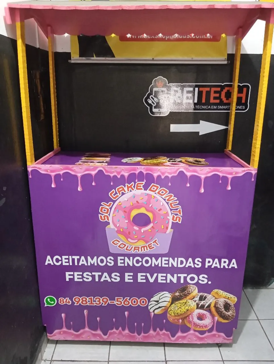 Barraca madeira pino com rodinhas silicone. Ideal pra vendas de doces, donuts e outros. Acompanha rampa pra descer de nível. Está adesivada com donuts mas pode mudar com outros adesivos. Aceito proposta ou troca por algo de meu interesse no mesmo valor.