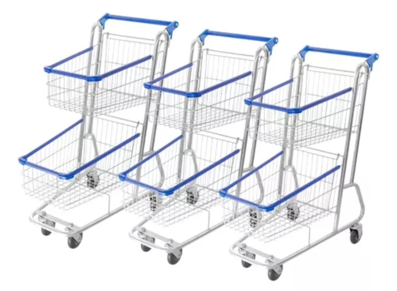 Carrinhos de compras em ótimo estado, ideais para supermercados, lojas e outros estabelecimentos comerciais. Com estrutura resistente e design moderno, possuem duas cestas para maior capacidade de carga. Aproveite esta oportunidade para equipar seu negócio com qualidade e praticidade! Valor por unidade.