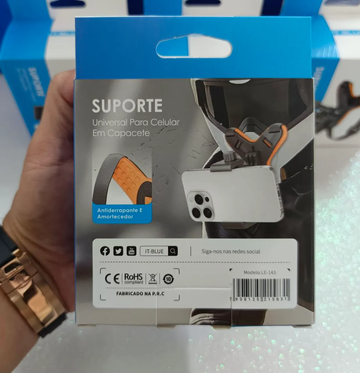 SUPORTE DE PLASTICO P/CELULAR REF: LE-143 Suporte universal para celular, ideal para uso em capacete. Possui design antiderrapante e amortecedor para maior segurança. Modelo LE-143 da IT-BLUE.