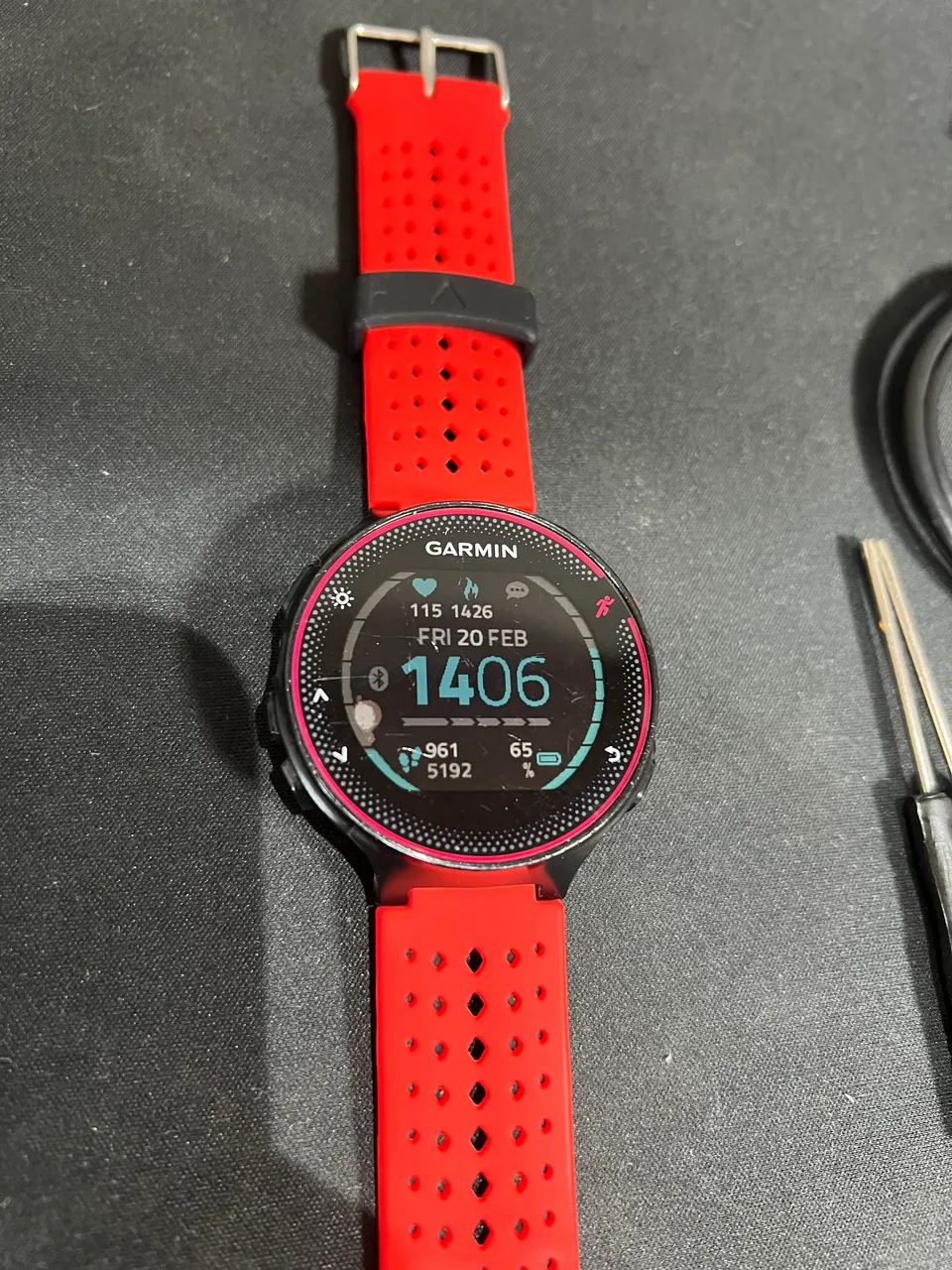 Smartwatch Garmin Forerunner 235: design moderno, monitoramento cardíaco, GPS integrado e notificações inteligentes. Ideal para atletas e entusiastas do fitness. Tela com um dano na parte inferior esquerda e alguns arranhões, mas funcionando perfeitamente todas as funções. Carregador um pouco danificado também mas funcionando! Não acompanha a caixa.