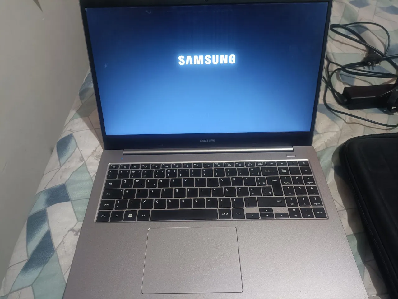 Notebook Samsung Essentials E20 usado com tela defeituosa (necessário substituir ou usar via HDMI). Possui SSD de 500 GB SATA, slot para NVMe e 4 GB de RAM DDR4. A configuração inclui processador Intel Dual Core Celeron 3865U de 1.90 GHz, tela LED HD de 15,6? e placa de vídeo integrada Intel HD Graphics 610. Acompanha carregador original e bolsa para transporte.