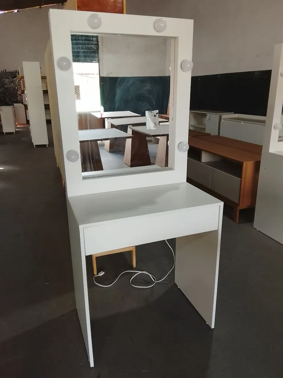 Linda penteadeira com design moderno e elegante, perfeita para organizar seus cosméticos e maquiagens. Possui espelho com iluminação embutida para facilitar a sua rotina de beleza.