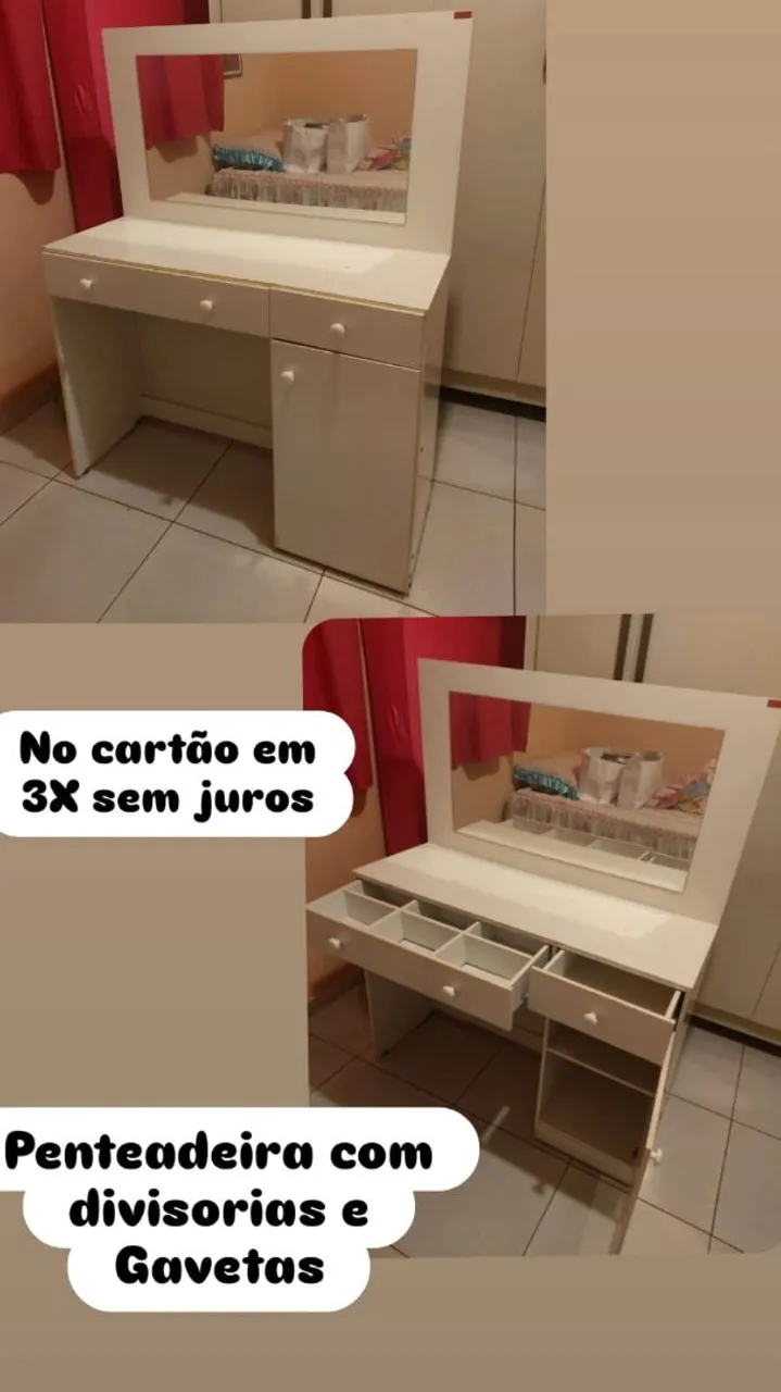 Linda penteadeira com design moderno, ideal para organizar seus cosméticos e itens de beleza. Possui gavetas espaçosas e divisórias, oferecendo praticidade e elegância para o seu dia a dia.
