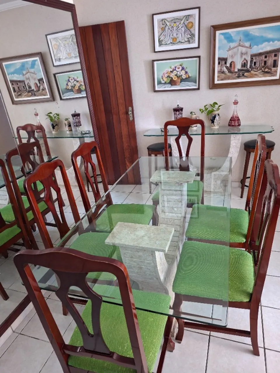 Linda mesa de jantar, com design elegante e sofisticado, com 6 cadeiras. A base de mármore com o tampo de vidro grosso, medindo 180 x 90cm, boleado nas bordas.