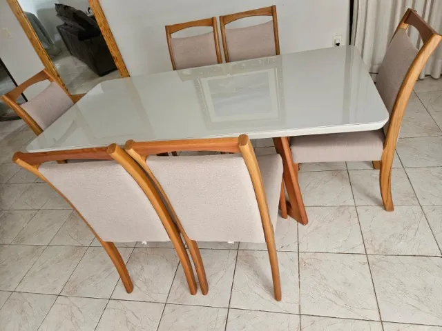 Mesa produzida em madeira maciça tauari, tampo de madeira maciça com vidro de 4 mm por cima, e cadeiras estofadas com espuma de assento D26 e encosto, D18, e pés de madeira maciça. Sala de Jantar muito bem trabalhada, fazendo com que possamos atender nossos clientes com maior satisfação