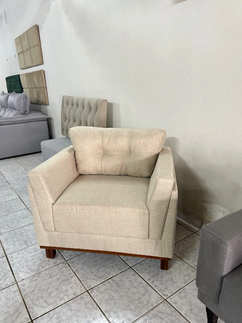 Poltrona com base rústica, tecido linho bege claro