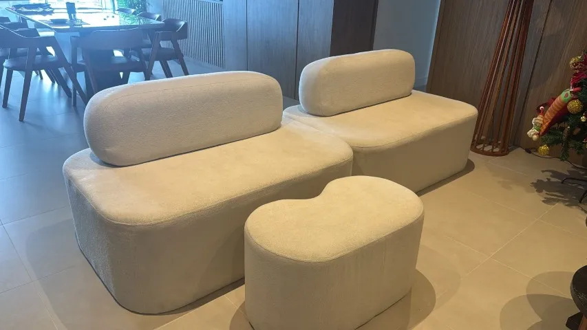 Vendo esse sofá minimalista arredondado com 2,60m em tecido Boucle bege com 3 meses de uso, bipartido e fiz impermeabilização! Excelente estado de conservação. Interessados enviar mensagem pelo whatsapp