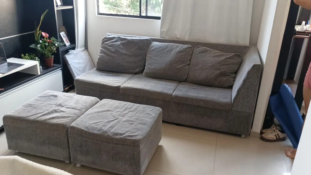 Sofá confortável e elegante na cor cinza, ideal para sua sala. Acompanha dois puffs que oferecem versatilidade e praticidade para o seu dia a dia. Inteiro, bairro Capim Macio. Valor 550 reais. Tratar
