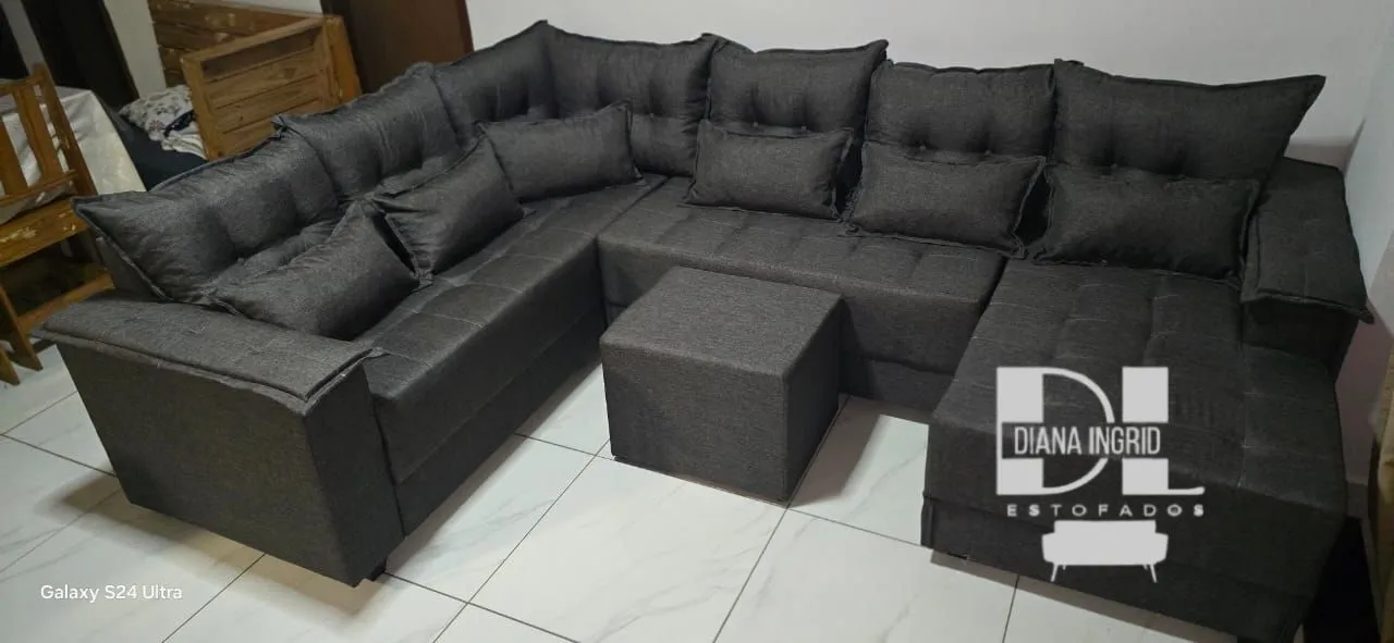 Sofá de canto moderno e espaçoso, ideal para ambientes amplos. Design elegante e confortável, perfeito para relaxar e receber convidados. Acompanha puff para maior comodidade.