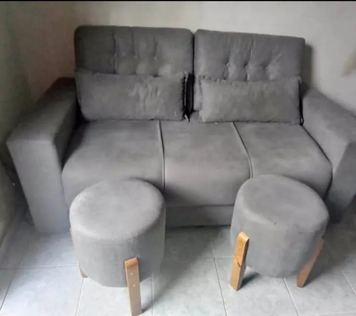 Conjunto perfeito para sua sala! Sofá confortável e elegante, acompanhado por dois puffs charmosos. Ideal para relaxar e receber visitas com estilo.