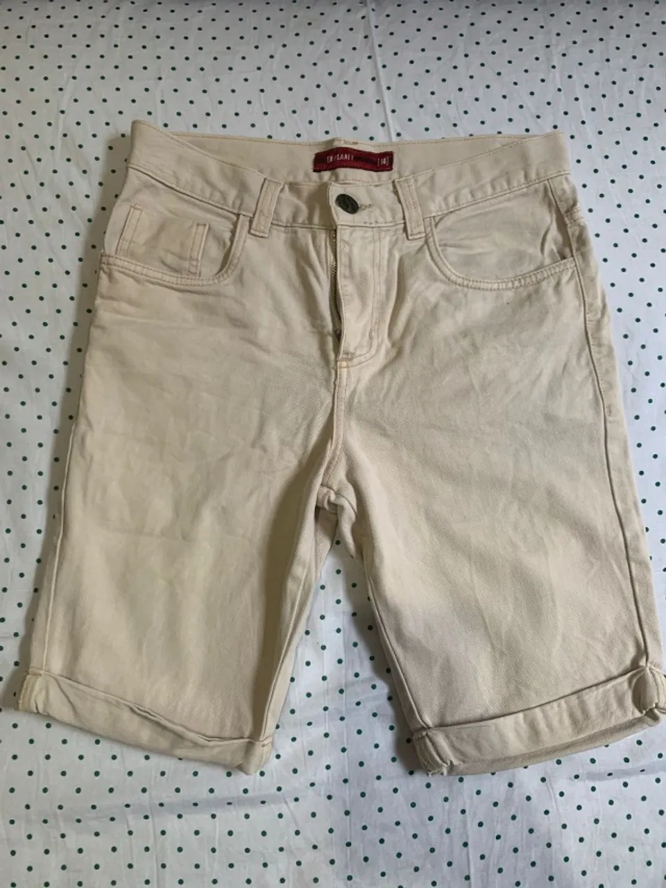 Bermuda masculina jeans, cor bege clara, com design casual e versátil. Possui modelagem reta, barra dobrada, fechamento por botão e zíper, passantes para cinto e bolsos frontais e traseiros funcionais.