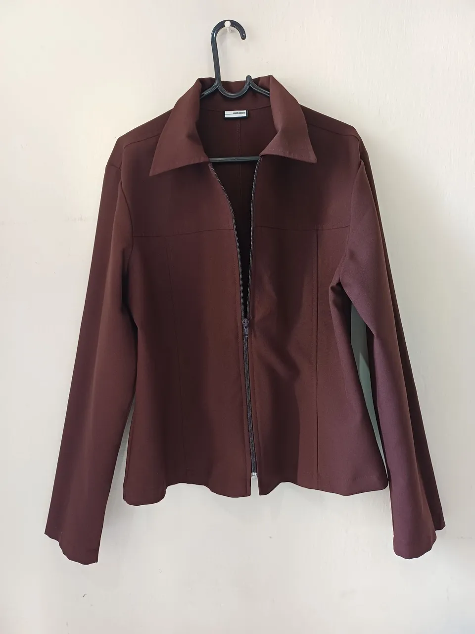 Elegante blazer feminino marrom, com um design sofisticado e prático. O zíper frontal está com defeito, não fecha pra cima. Tirando este detalhe, o blazer está em perfeito estado. Uma peça chave para um guarda-roupa estiloso!