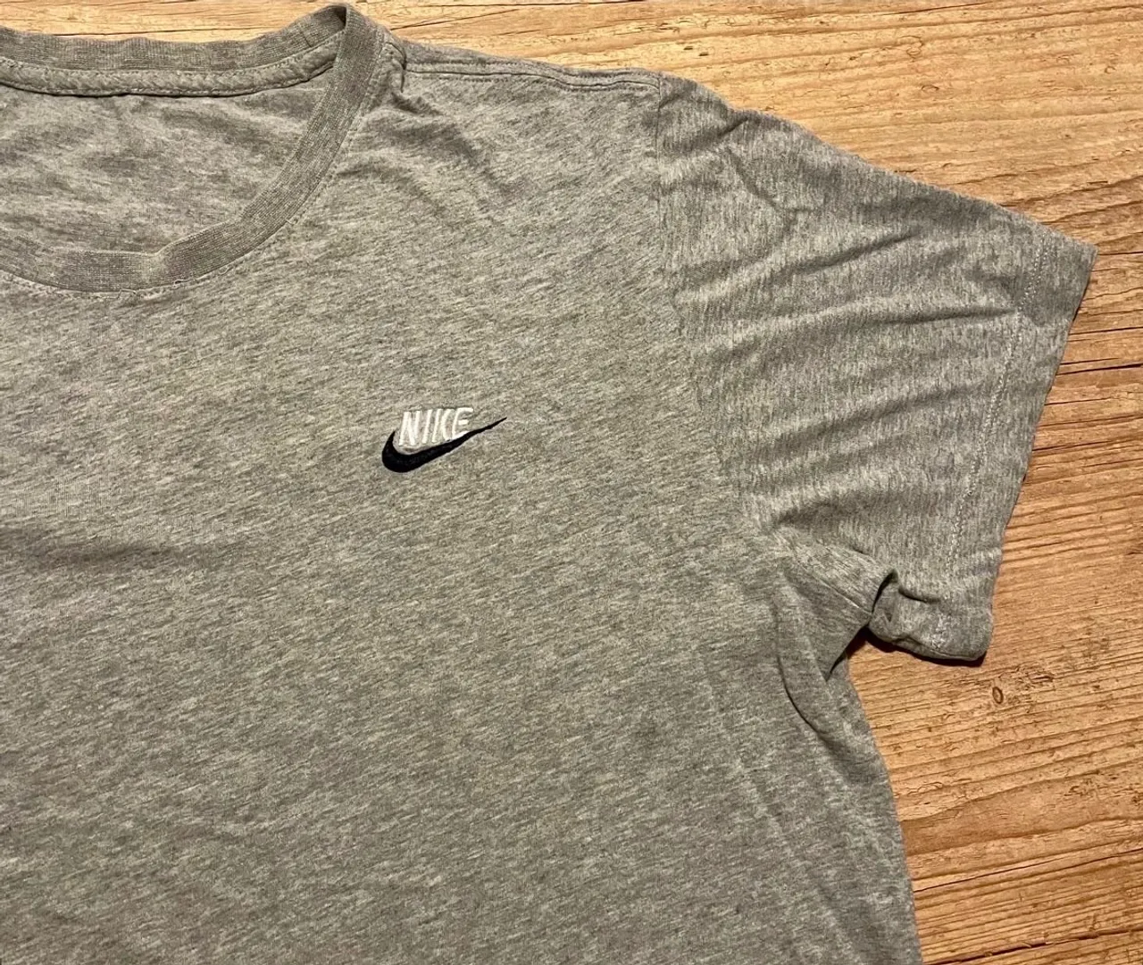 Camiseta Nike tamanho M, cor cinza mescla. Peça usada, mas em bom estado. Logo bordado, tecido confortável e sem detalhes graves.