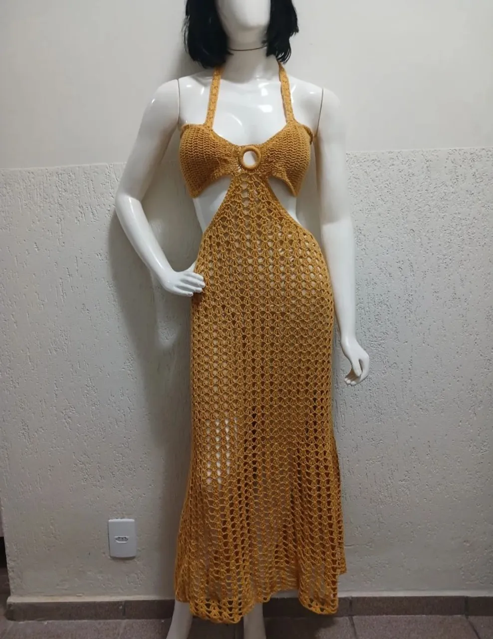 vestido artesanal, possui elástico na cintura, bojo, e forro.
