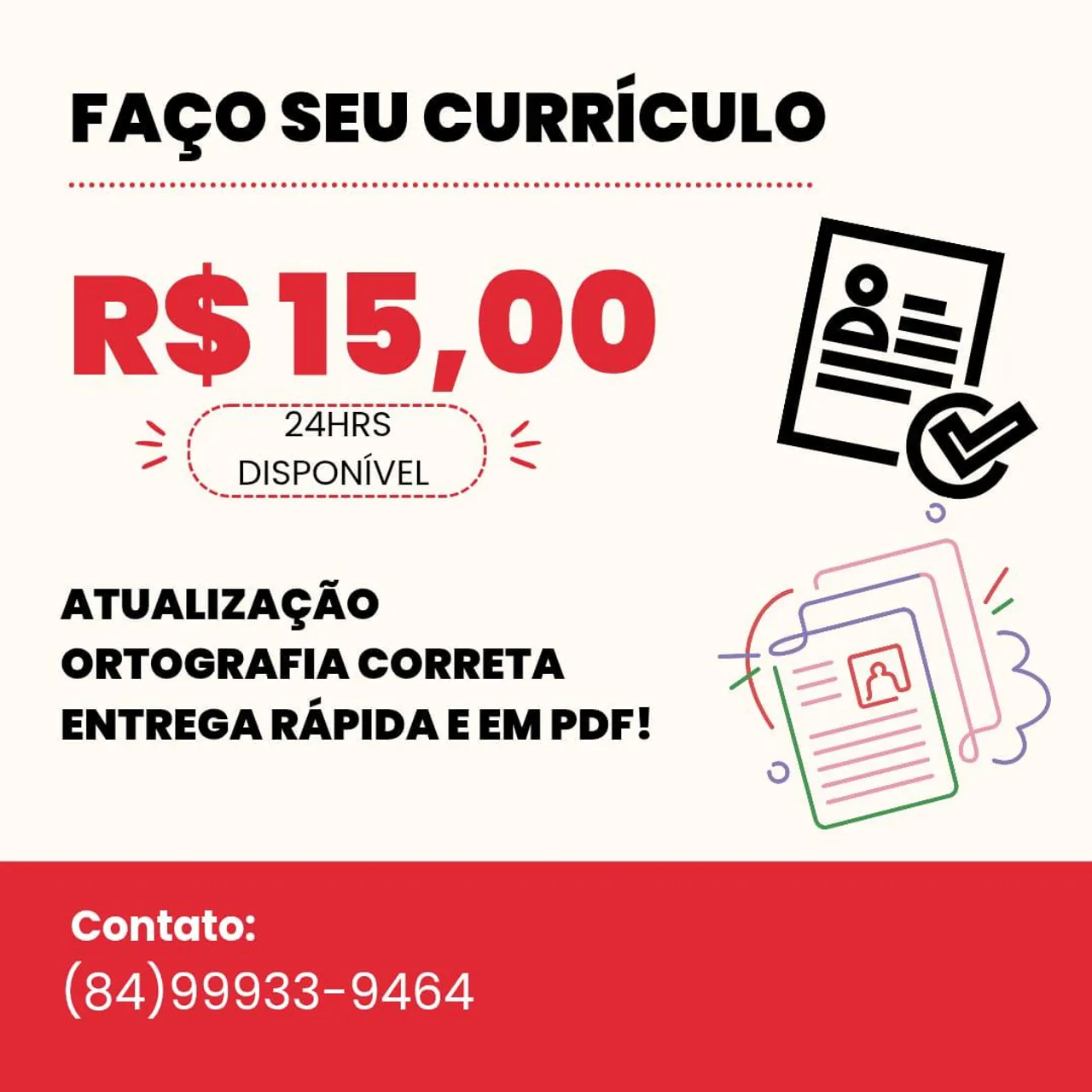 Faço seu CURRÍCULO, com ortografia correta, completo e atualizado, pronto para te ajudar a conquistar a vaga dos seus sonhos! Entrega rápida e em PDF. Entre em contato para saber mais. Apenas R$ 15,00 reais. Me chama no chat ou no número 84 ... ver número.